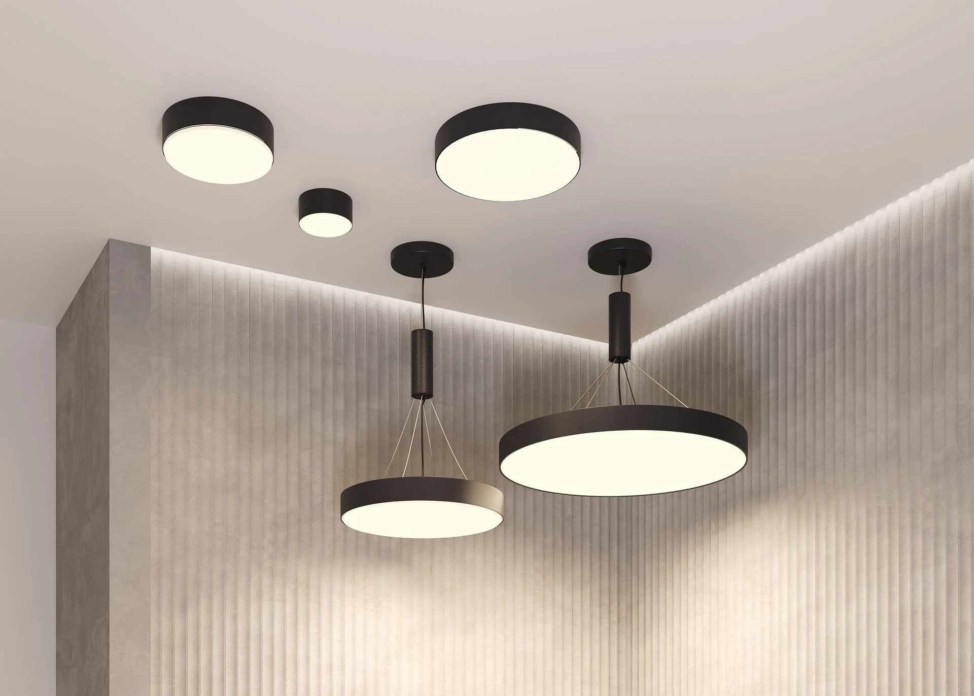 Материал корпуса - металл; цвета - чёрный, белый и золотой. Формы корпуса: круглая и квадратная. Типы монтажа: накладной, подвесной, а также трековые светильники. Подвесной монтаж универсален для обеих форм. Монтаж без видимых болтов. Варианты мощностей: 12W, 24W, 36W, 45W и 90W. LED-источник света. Цветовая температура - 3000 или 4000К. Высокий коэффициент цветопередачи. Совместимость с драйверами DALI и Triac для изменения цветовой температуры и диммирования. Аксессуар для монтажа круглых моделей в ГКЛ под шпаклёвку и универсальное крепление в ассортименте.